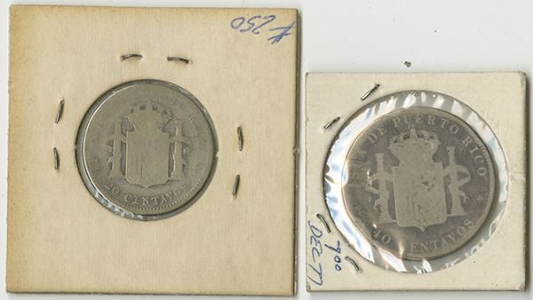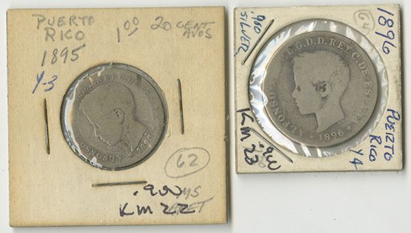 Puerto Rico. Lot of 2 coins, includes a 20 Centavos, 1895, KM-22, Fine and a 40 Centavos 1896, KM-23, in Choice Good to VG condition.