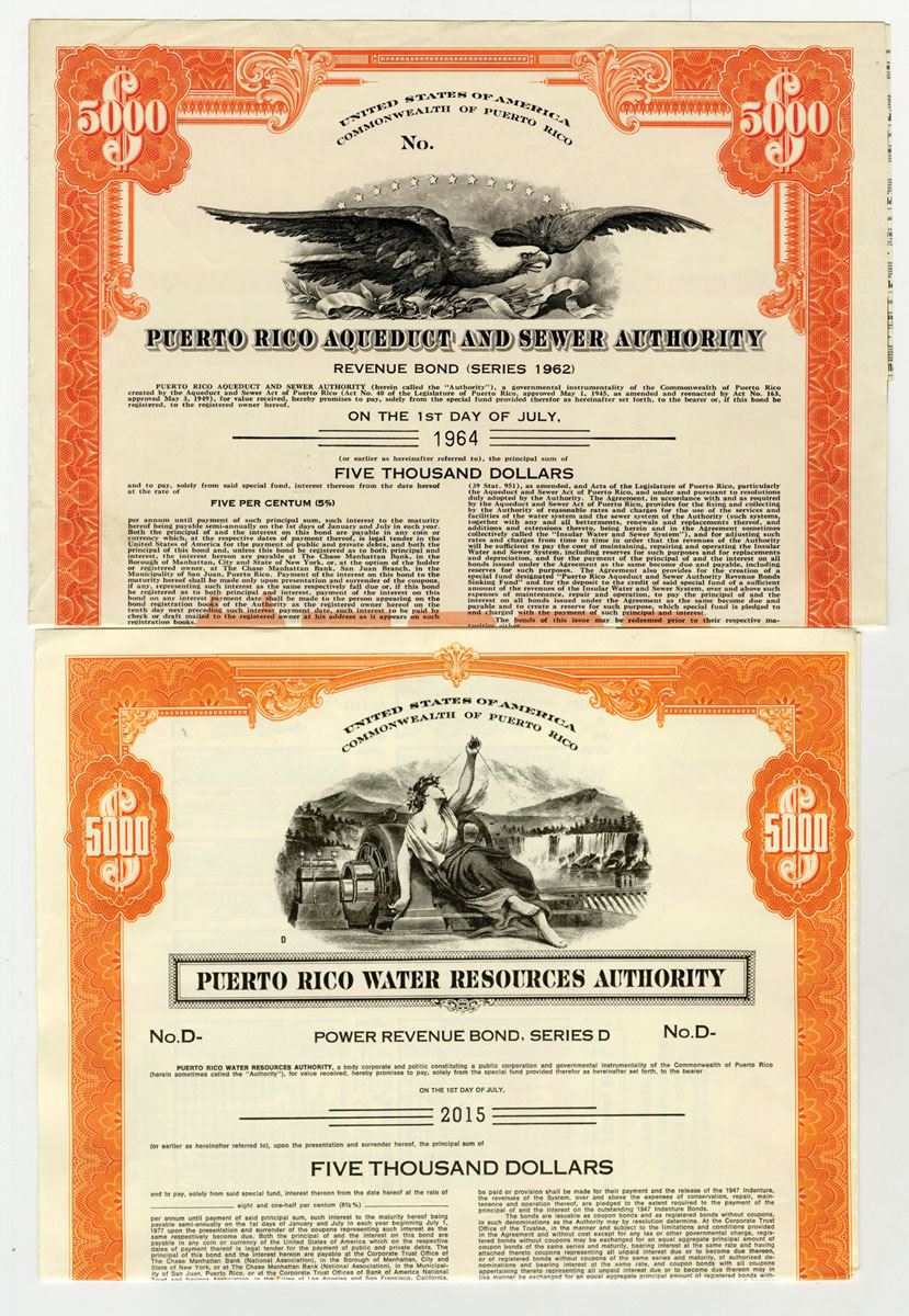 Puerto Rico. Lot of 2 Specimen Bonds, Puerto Rico Aqueduct and Sewer Authority 1962 $5000 4 coupons; Puerto Rico Water Resources Authority 1976. $5000 with coupons. VF to XF condition, SCBN.
