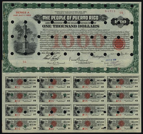 Puerto Rico, Jan. 13, 1936, $1000, 3 1/2% Loan of 1935 (1945-65), Series A. Irrigation Extension, Cert.#54, Issued and multiple punch cancelled, Coupons included, but not attached, Issued in Washington, D.C., Green border with vignette of Columbus Cross on left, This bond was issued by an "Act of Congress approved on March 2, 1917, entitled and Act too provide a civil government for Puerto Rico....", other than the POC's the bond would grade XF. BEP. Rare U.S. Federal Bond.