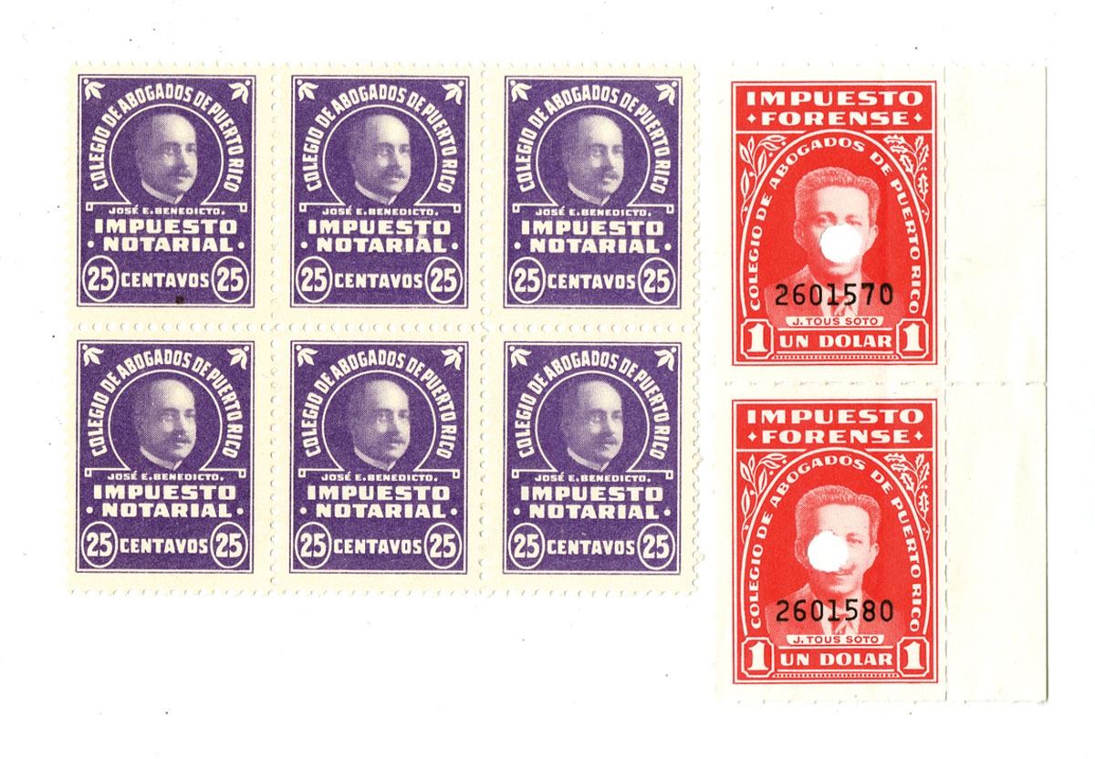 Puerto Rico, ND (1930s-50s). Lot of 8 Stamps, Includes: Colegio De Abogados De Puerto Rico - Impuesto Notarial Sheet of 6 25 centavos, purple with photo portrait of Jose E. Benidicto in middle, ungummed as issued, excellent centering; Impuesto Forense - Colegio de Abogados De Puerto Rico Pair of 1 Dollar Notes, Red/orange with J. Tous Soto at center, POCs at center. Stamps are VF to XF condition.