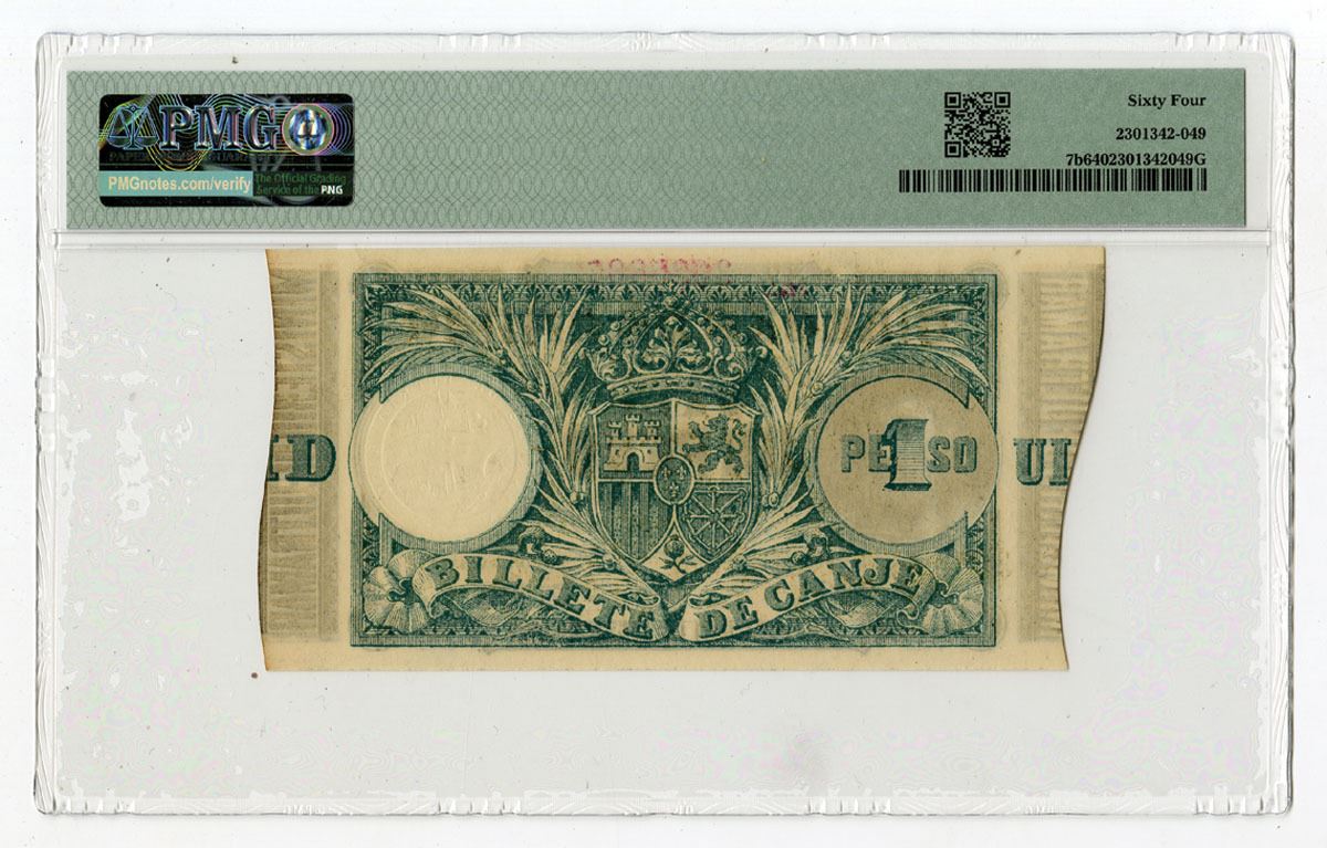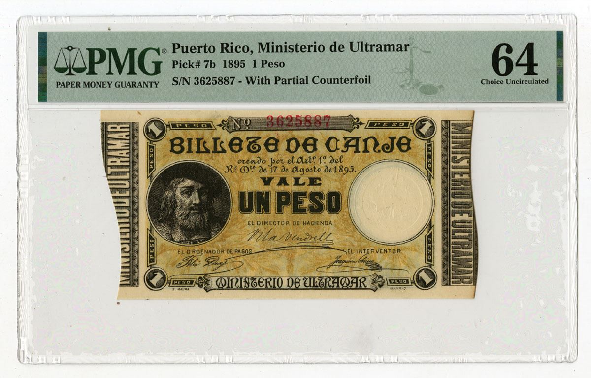Puerto Rico. 1895. 1 Peso, P-7b, Issued banknote, Black and orange-brown printing with portrait of a man at left and partial counterfoil, Back is blue with crowned arms of Spain at center, S/N 3625887, PMG graded Choice Uncirculated 64. Rare in this high of grade.
