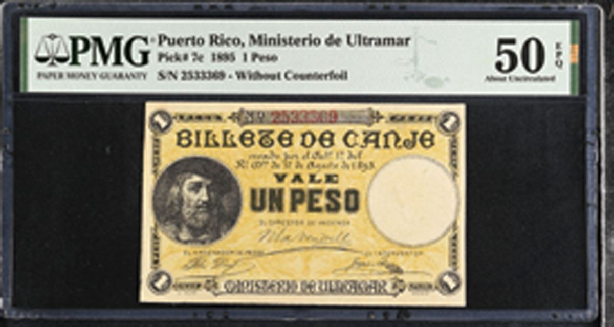 Puerto Rico, 1895. 1 Peso, P-7c, Issued Banknote, Black on gold underprint with portrait of man at left, Back is dark blue-green with arms at center, Note is without counterfoil, S/N 2533369, PMG graded About Uncirculated 50 EPQ.