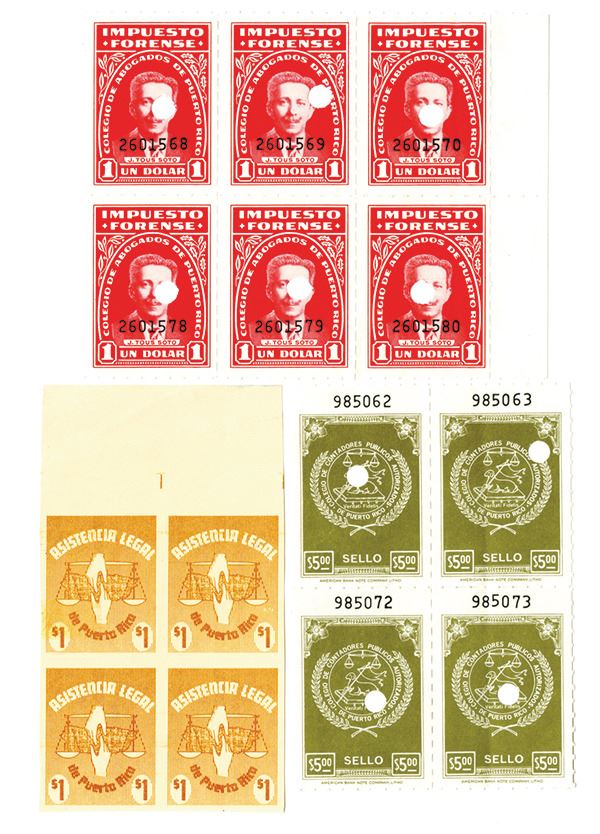 Puerto Rico, Lot of 3 blocks with a total of 10 stamps, Includes a block of 4 of Asistenca Legal de Puerto Rico, $1, Imperforate, bistre-brown; College Stamp, $5, Block of 4, Olive green, rouletted; and Block of 6 of Impuesto Forense $1 block of 6, rouletted, all in XF condition, all ungummed. From ABN Archives. Rare Puerto Rico Revenue stamps.