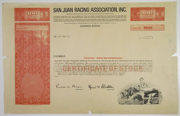 Puerto Rico, ND (1960s-1970s). 100 Shares Proof Stock Certificate, Black text with orange border at left and underprint, Man with a clock and horse racing in background at bottom right corner. XF condition, SCBN. The San Juan Racing Association was a San Juan, Puerto Rico based company that owned the El Commandante thoroughbred race track and had interests in broadcasting.