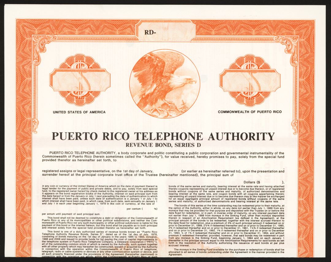 Puerto Rico, 1978. $-odd, Revenue Bond, Series D, Specimen bond, Orange border with eagle vignette with black text, No coupons attached, Specimen overprints and POC's, XF condition. Scarce Puerto Rico government run telephone company. Jeffries BNC.
