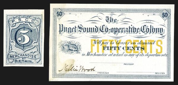 Port Angeles, Washington Territory, Lot of 2 notes, ND (ca. 1887), 5 Cents, P-Unlisted, Blue with no underprint, measures 1.25 by 1.75 inches, Company initials on top with denomination in middle with text on bottom "Merchandise at Retail", Uncirculated; and 50 Cents, P-Unlisted, Blue with gold underprint of the denomination "FIFTY CENTS", a pair of small quail to the left of the denomination, partially issued and signed by Treasurer "Nellie Wood" with denominations in diamonds on the top left and right corners, measures 3.75 by 2.25 inches, . The Puget Sound Co-operative Colony was a Utopian collective established at Portland in May 1887 and moved to the mouth of Ennis Creek, Port Angeles, Washington Territory in June of that year. Rare Western Territorial banknote pair. "West Shore Litho & Eng. Co. Portland, OR."