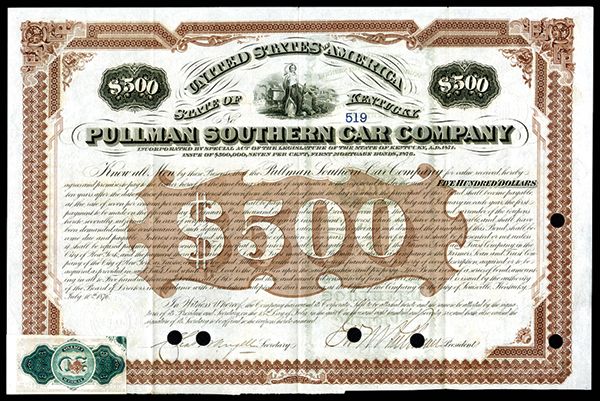 Pullman Southern Car Company, Bond Kentucky,$500, July 1876, Beautiful Motif, Bond Signed by Pullman, as President, VF, WBNC.