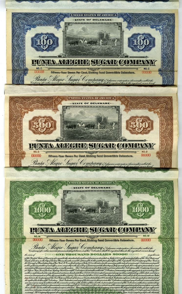 Cuba (Inc. in Delaware), 1922. Lot of 3 15 Year 7% Sinking Fund Convertible Debenture Coupon Bonds in 3 different denominations: $100 in blue, $500 in brown, $1000 in green. All bonds have vignette of men harvesting tobacco, Specimen overprints and POCs, are in VF to XF condition, and printed by ABNC. (3). Sold "AS IS" no returns accepted.