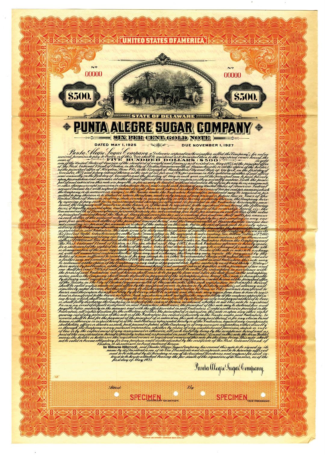 Cuba (Inc. in Delaware). $500 Specimen 6% Gold Coupon Bond, Black print on an ornate orange border and under tint, Image of cattle in a field hooking up to a cart, Specimen overprints, POC's, VF-XF condition, ABNC.