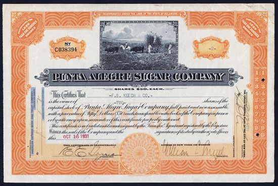 Delaware, 1931, 2 Shares, Issued and Uncancelled Stock, #C038394, Black on orange border and underprint, Vignette top center of sugar plantation workers, VF-XF condition, ABNC.