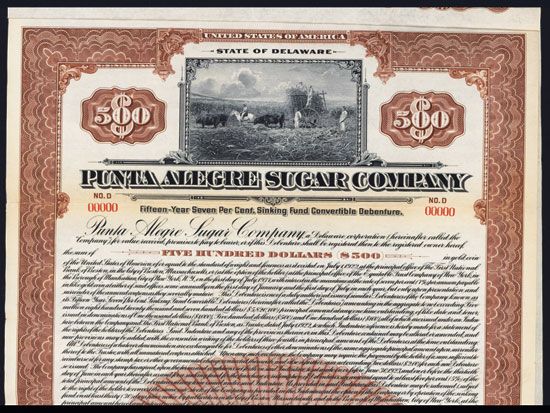 Delaware, 1922, $500, 15 Year 7% Sinking Fund Convertible Debenture, Specimen Bond, Black on brown border and underprint, Vignette top center of sugar plantation workers, Red SPECIMEN overprints POC's and red s/n Ò00000Ó, VF-XF condition, ABNC.