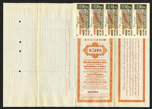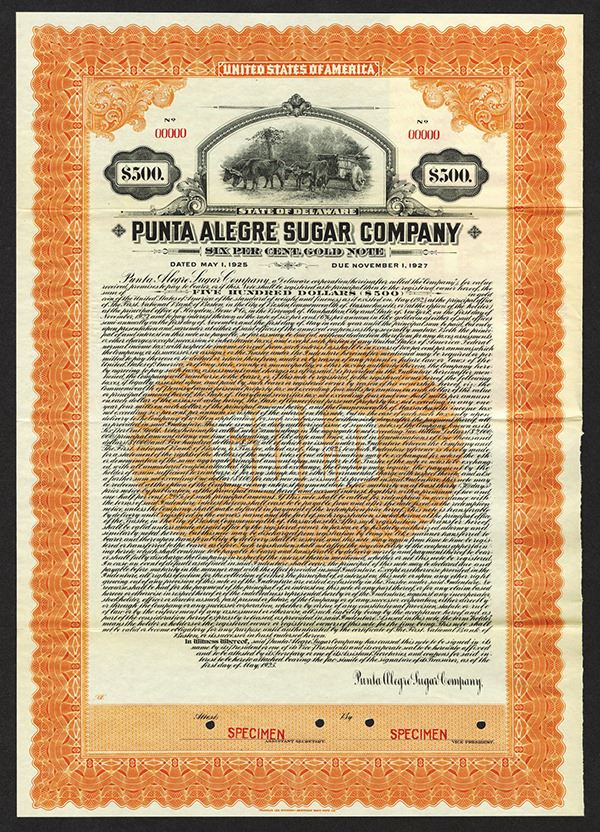 Delaware, 1922, $500, 15 Year 7% Sinking Fund Convertible Debenture, Specimen Bond, Black on brown border and underprint, Vignette top center of sugar plantation workers, Red SPECIMEN overprints POC's and red s/n "00000", VF-XF condition, ABNC.