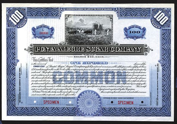 Cuba (Delaware incorporation), 100 Shares, Common, Black on blue border and underprint, Sugar cane field with workers and oxen pulled wagon. XF, POC. ABNC.