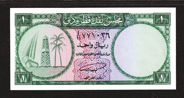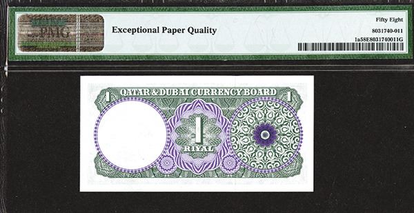 Qatar & Dubai. 1 Riyal. P-1a. Emblem at left end. PMG graded Choice About Uncirculated 58 EPQ.