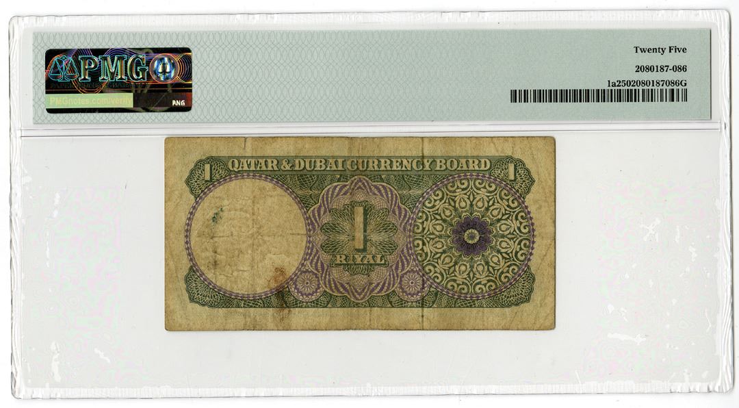Qatar & Dubai, ND (ca. 1960). 1 Riyal, P-1a, Issued banknote, Green on multicolor underprint, S/N A/6 630969, Watermark: Falcon's Head, PMG graded Very Fine 25. Printer: BWC.