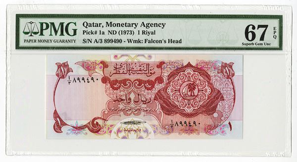Qatar. Issued 1 Riyal, P-1a, s/n 899490. PMG graded Superb Gem Uncirculated 67 EPQ.