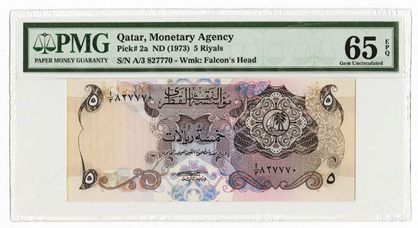 Qatar. Issued 5 Riyals, P-2a, s/n 827770. PMG graded Choice Uncirculated 65 EPQ.
