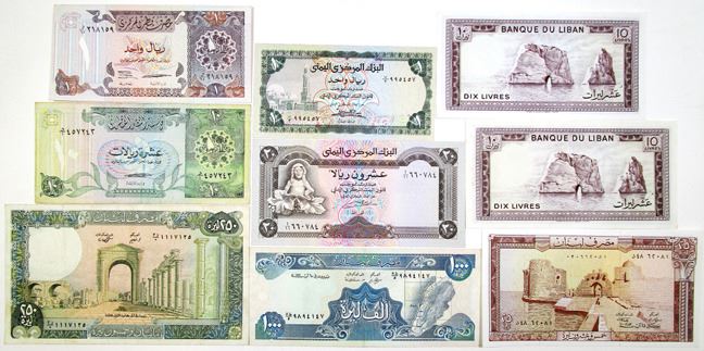 Qatar, Yemen, and Lebanon...... Lot includes Qatar Monetary Agency, ND (1980s). 10 Riyals, P-9; Qatar Central Bank, ND(1996). 1 Riyal, P-14; Banque du Liban, 1964-86, 10 Livres, P-63 (2). 25 Livres, 1964-83, P-64. 250 Livres, 1978-88, P-67; Central Bank of Yemen, ND(1973). 1 Rial, P-11b, and 20 Rials P-14a. Notes range from VF-UNC condition. Sold as is, no returns accepted. (9).
