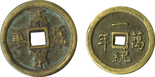 China, 10,000-year reign coin, circa 1660, 110 Cash, 40mm, EF; Hsien-feng, 10 Cash, (1851-1861) 45mm, EF, light encrustation. [2]