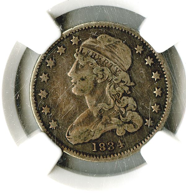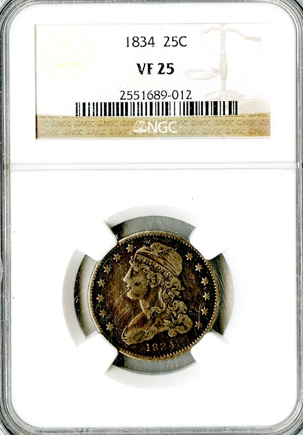 Quarter Dollar, 1834. Reverse rotated to 7:30. Graded VF25.