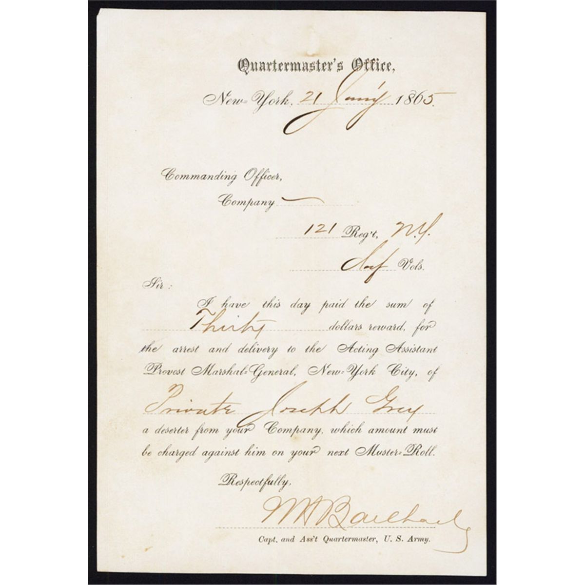 January 21, 1865, Issued Quartermaster's Office receipt for the payment of $30 reward for the arrest and return of a deserter from the 121st Regiment, New York to the Acting Assistant Provost Marshal General, New York City, of Private Joseph Grey. Signed by Capt. and Ass't Quartermaster, U.S. Army. VF condition.