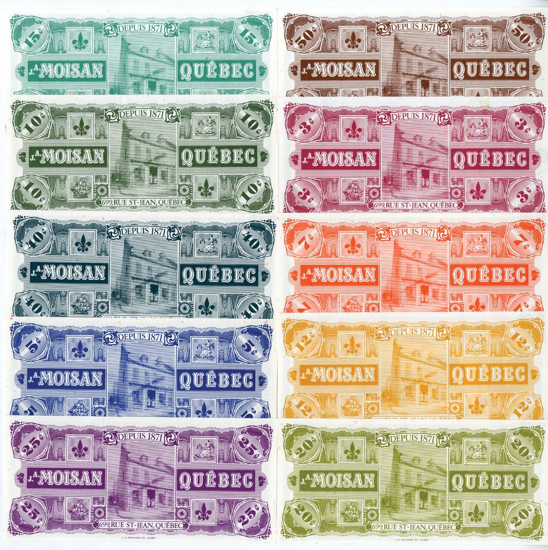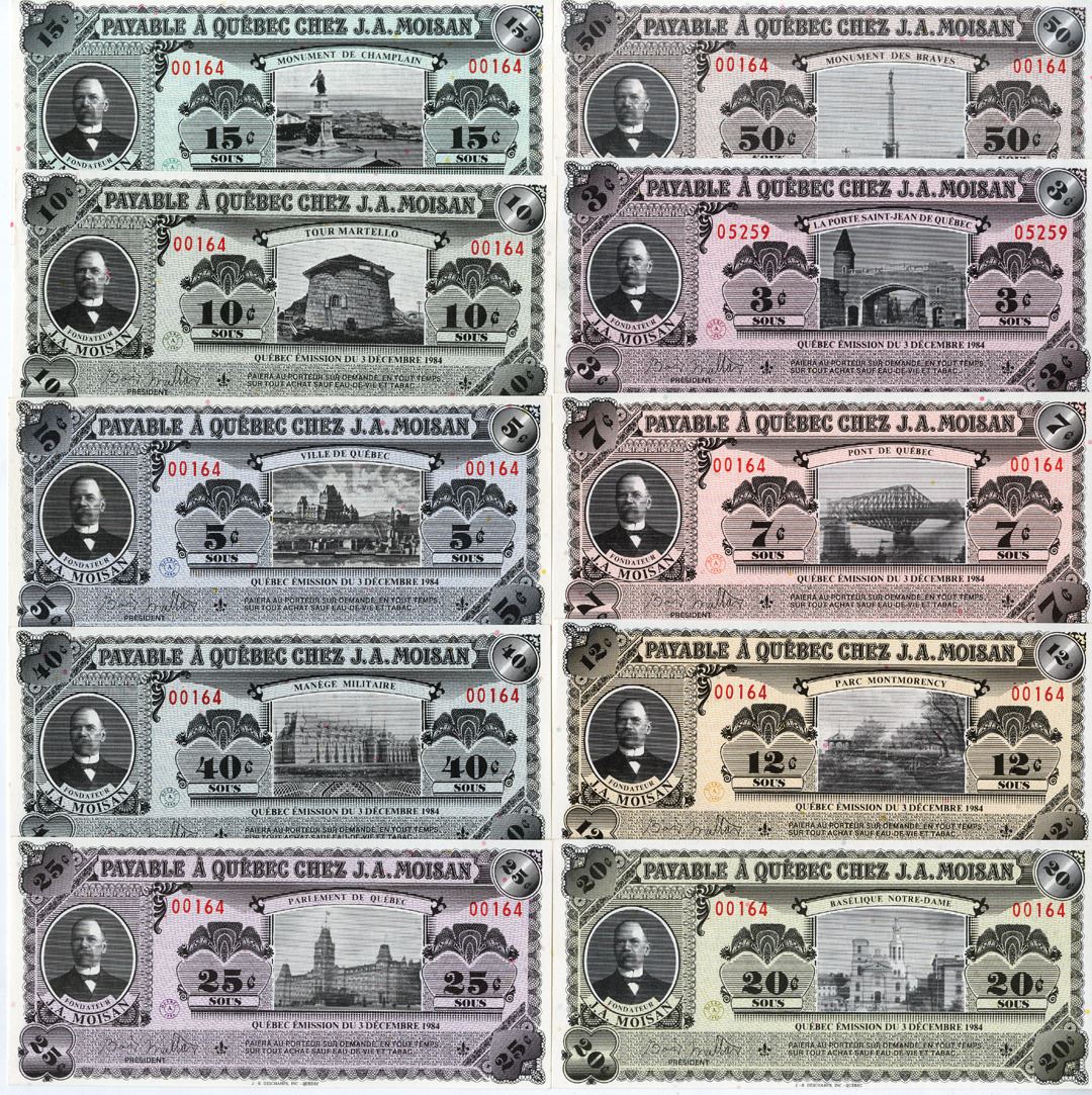 Quebec, Canada, 1984. Collection of scrip notes from this famous French Canadian grocery, and department store, Includes: 3 Cents, 5 Cents, 7 Cents, 10 Cents, 12 Cents, 15 Cents, 20 Cents, 25 Cents, 40 Cents, & 50 Cents. Other than the 3 cent denomination, all of the others have the same low serial #00164, Notes are Uncirculated to CU condition, (10). Sold "AS IS" no returns accepted. The J.A. Moisan grocery store, founded in 1871, is a Quebec landmark grocery and shopping store.