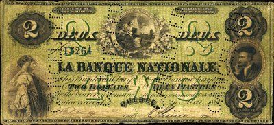 May 25, 1860. P-S842c. $2. Issued banknote. 4 small pin punched "Cancelled" overprints. "Reapers" on lwer left, Quebec Arms Center and Jacques Cartier on right. Note is in VG conditionwith minor edge faults. Rare note. ABNC