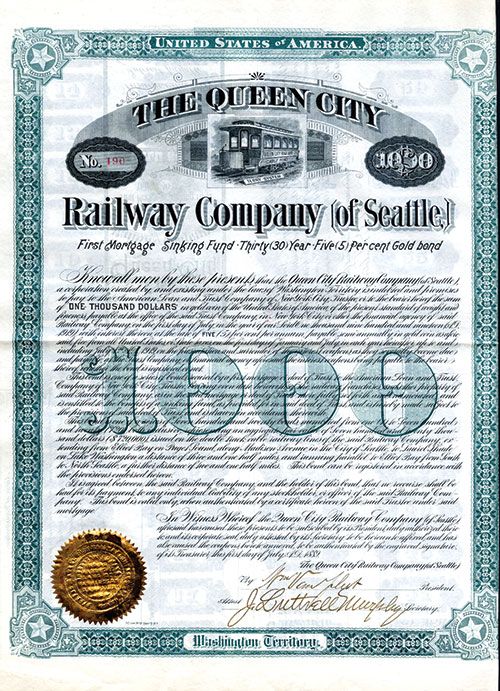 Washington, 1889, $1000, 1st Mortgage Sinking Fund 30 Year 5% Issued Bond, Coupons attached, #190, Black on green border and underprint, Gold seal bottom left with electric trolley top center, VF condition, S.C. Law. Listed railroad and bond in Cox.