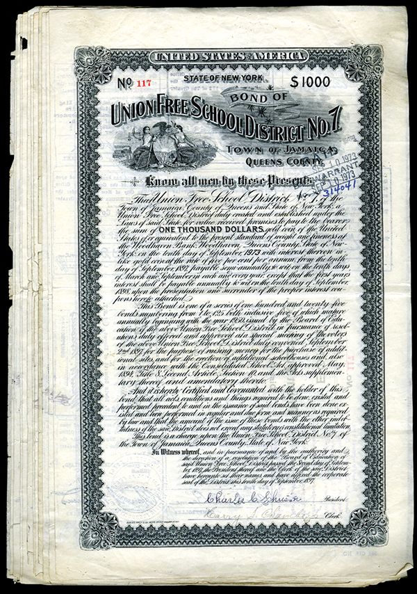 Queens, New York Bond Assortment. 1880's & 1890's. Union Free School District No. 7. Jamaica, NY. $1,000. 1897(12); Similar, but District 1; Long Island City Flushing Avenue Improvement(4); Village of Richmond Hill(2). Most are VF+, though a few have condition problems. Must be seen. Sold as is. [19]
