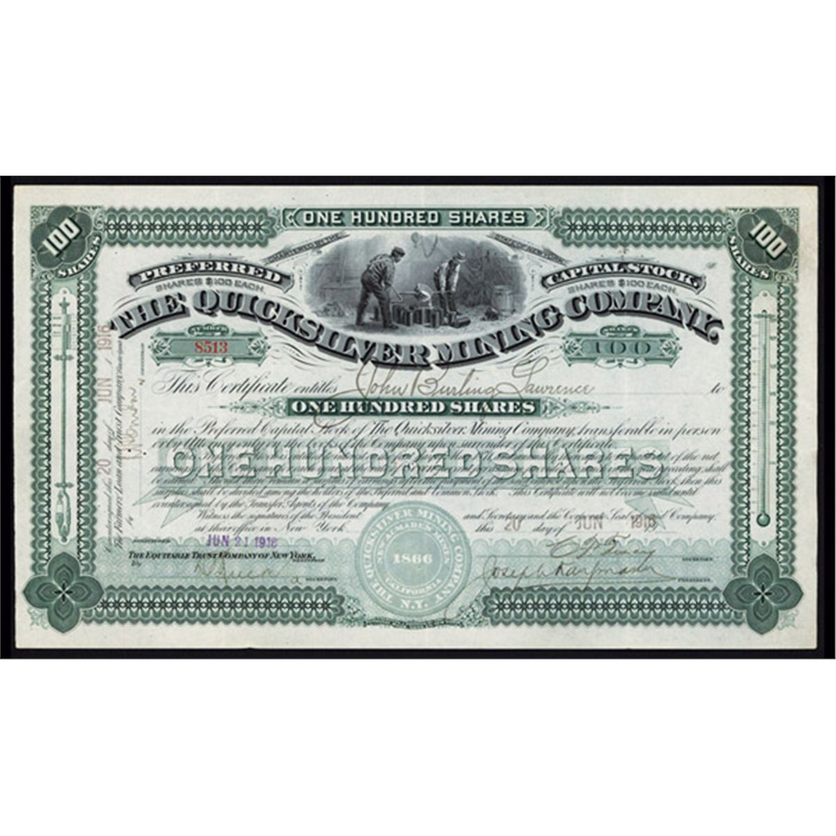 California, New Almaden, Santa Clara County, 1916, 100 Shs., Preferred, Miners over ornate curved title pouring quick silver or mercury into canisters, early thermometer and barometer on left and right borders, Green, XF, National BNC. Attractive and scarce mining stock.