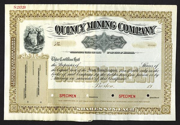 Michigan. Odd Shares, Specimen, Black with brown border, Michigan arms at top left, Specimen overprints & POC's, Rare as a specimen. VF with wavey paper. ABNC.