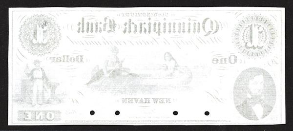 New Haven, CT, $1, Haxby 300-UNL, W0750-001-UNL, Proof banknote printed in black on india paper, PCGS graded Choice About New 58, POC's, TCC. Rare note.
