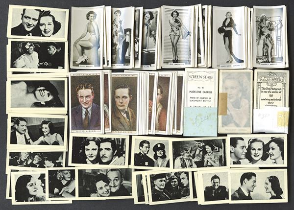 R. & J. Hill. Scenes from the films (40); Carreras Ltd. Film Stars (54); Lambert & Butler. Popular Film Stars (50); W.D. & H.O. Wills. Cinema Stars (25); Abdulla & Co. Ltd. Screen Stars. (40, 2 sets). As new as one could expect. 249 pieces.