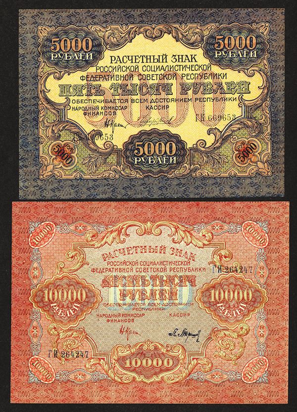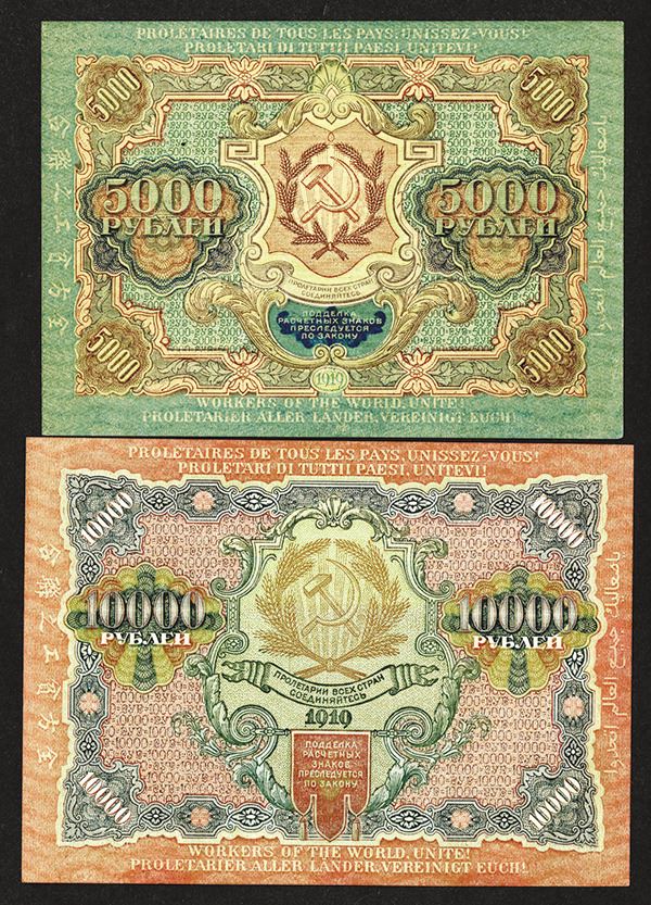 Russia - R.S.F.S.R. 5000, 10,000 Rubles. P-105a, 106a. With the popular slogan: Workers of the World, Unite! In multiple languages in the border. Both Choice Uncirculated. 2 pieces.