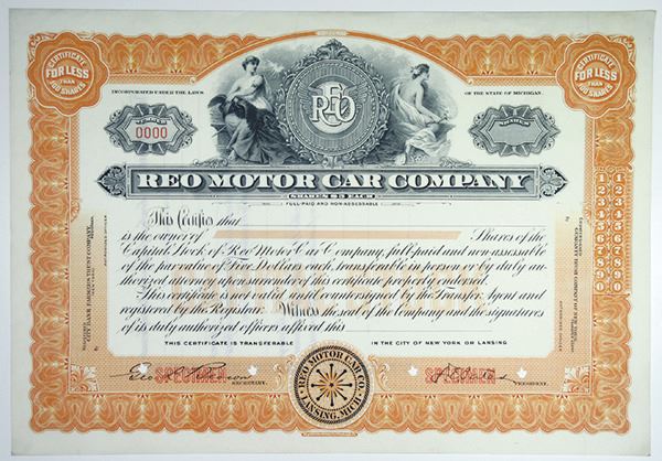 Michigan. <100 Shares Capital Stock Specimen Certificate, Black print on orange border and under tint, Allegorical women at top flanking company title logo at top, Specimen overprints with cut outs, VF-XF condition, RBNC. The REO Motor Car Company was a Lansing, Michigan-based company that produced automobiles and trucks from 1905 to 1975. At one point the company also manufactured buses on its truck platforms.
