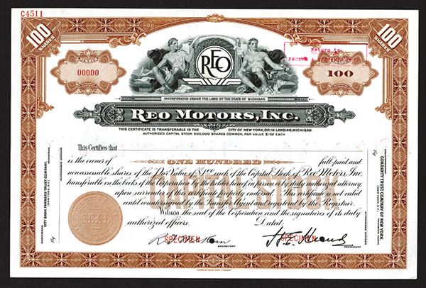 Michigan. 100 Shares, Black on brown border and underprint, Allegorical men flank REO logo, XF condition. ABNC. Rare as specimen.