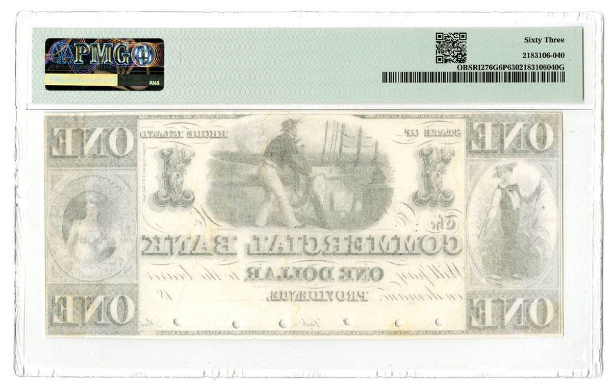 Providence, Rhode Island, ND (1830s-50s). $1, RI276G6P, Proof Banknote, Black printing with sailor at the help at top center and small child with corn at left and allegorical Native woman at right, POCs along bottom, PMG graded Choice Uncirculated 63, DTC. This is one of only two examples of this note listed in the PMG census of obsolete banknotes. From a new estate find that had been in the family since the 1890s. This is the first time this note has been offered at public auction..