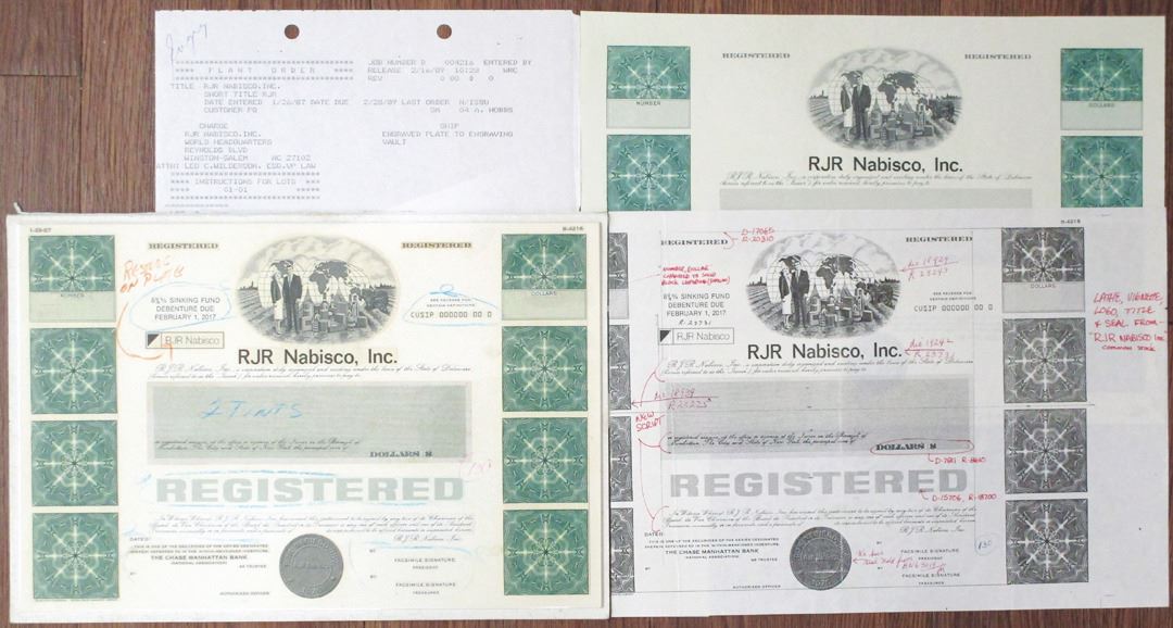 Lot includes 4 pieces: $Odd Proof Mockup 8 3/8% Registered Sinking Fund Bond, Black text with green border and underprint, Allegorical man and woman with goods at top center. Mounted on a hard backdrop, Fine condition. Unique proof made during bond design process. Lot also includes a Plant Order form with engraving details; Photocopy of bond in black and white, with various design notes in red ink; Approval Progress Proof Bond, initials at bottom right corner. 4 pieces total. RJR Nabisco, Inc., was an American conglomerate, selling tobacco and food products, headquartered in the Calyon Building in Midtown Manhattan, New York City. RJR Nabisco stopped operating as a single entity in 1999; however, both RJR and Nabisco still exist. (4)