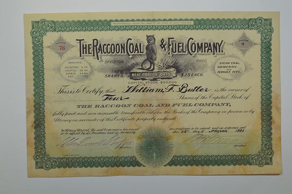 Vinton, Ohio (Incorporated in WV). 1901. Issued and uncancelled stock certificate. 4 Shares. Hilarious raccoon that looks like a cat. List of chemical composition of coal. Certificate is water stained, otherwise it is in decent shape.