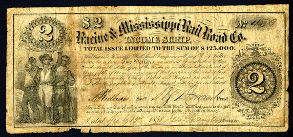 Racine & Mississippi Rail Road Co., 1858 Income Scrip Obsolete Banknote. Racine, Wisconsin, July 15th, 1858, $2, Racine & Mississippi Rail Road Co. (WI-686-SC8). Issued Obsolete Note. Farmer, sailor and hunter hold counter with '2' at left; ornate medallion counter with '2' at right. S/N 433, Choice VG to Fine condition due to toning and small edge faults on bottom left margin, This issuer was formed on March 29th, 1856, as a result of the business combination of the Racine and Mississippi Railroad Company and the Savannah Branch Railroad Company, and after a series of combinations and divestitures, ended up as part of the Chicago, Milwaukee, St. Paul and Pacific lines. All of these scrip issues are rare; this is an issued example from the $125,000 issue which provided the bearer a call on the income earned by the segment of the road built between Beloit and Freeport. R-7 in Krause where a remainder of this note was in his collection. Rare and possibly unique issued.