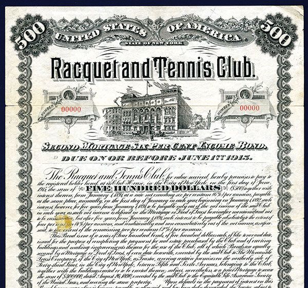 New York, 1890, $500, 6% 2nd Mortgage Income Bond, Black print with ornate border, Club's building top center, VF condition, ABNC.