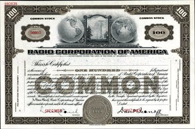ca.1920-30's. 100 Shs. Specimen stock certificate. Radio and electric power lines flanked by World Globes. Red specimen overprints, POC's and "00000" serial numbers. XF condition. David Sarnoff facsimile signature as president. Rare early RCA certificate. ABNC.