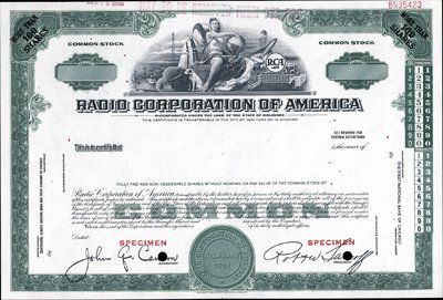 ca.1920-30's. 100 Shs. 3 different stock specimens. All with vignette of allegorical woman with globe, ocean liner, RCA Victor puppy "Nipper", rocket and RCA company logo. 100 shares, brown; 100 Shares, green border. All with facsimile signature of Robert Sarnoff. Red specimen overprints, POC's and "00000" serial numbers. All in XF condition. Rare certificates. ABNC.