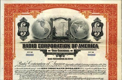 Radio Corporation of America Bond - Gold Debenture Bond. 1922. $1,000. Specimen Variable Rate Gold Bond. Orange border. Globes of earth flank Radio lines and towers. Coupons attached. Red specimen overprints, POC's and "00000" serial numbers. XF condition. Extremely rare and attractive bond. ABNC.