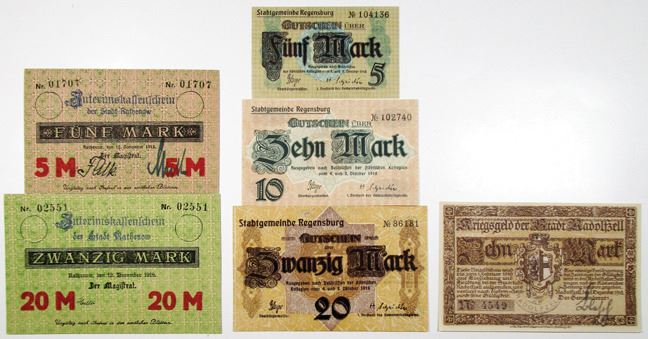 Germany. 1918, Lot includes 6 notes from Radolfzell a 10 Mark Notgeld with arms at center and validation handstamp; from Rathenow a pair of 5 and 20 Mark with black, red, and blue text on underprint and arms at back; and from Regensburg a trio of 5, 10, and 20 Mark Notgeld, all hand stamped ENTWERTET ("devalued" in German) on back. About to Choice Unc. (6)