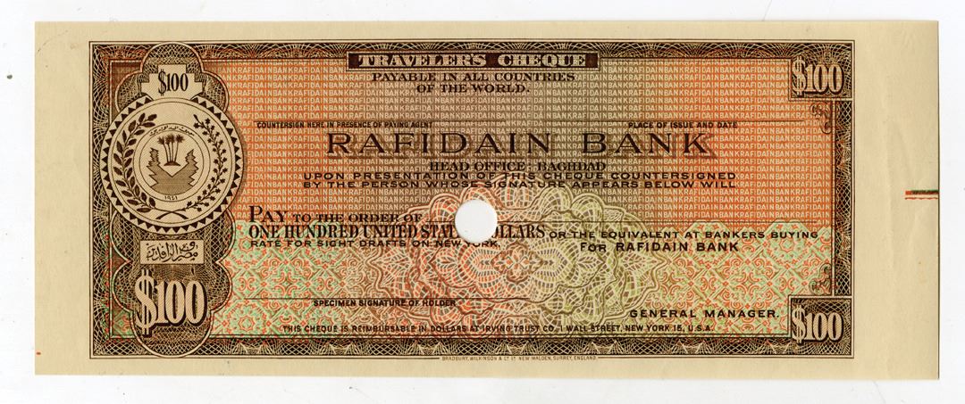 Baghdad, Iraq. Specimen 100 Dollars traveler's cheque, uniface, no signatures or numbers. Emblem of Rafidain Bank at left. POC. AU-Unc. BWC.