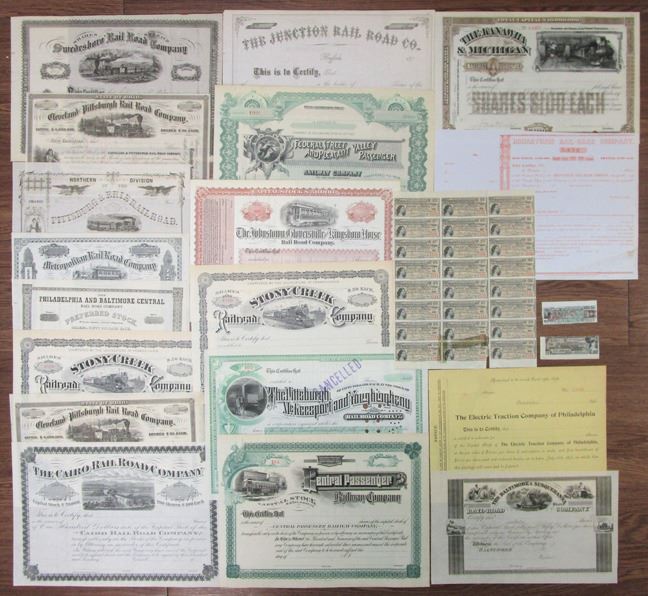 PA, IN, OH, WV, NJ, NY, MI and other states.....,., Lot of 20 Unissued Stock Certificates, highlights include: Pittsburgh & Erie Railroad, Metropolitan Rail Road Co., Philadelphia and Baltimore Central Rail Road Co., Stony Creek Railroad Co., Cairo Rail Road Co. and more. Pieces are in VF-XF condition. (20). Sold "AS IS" no returns accepted.