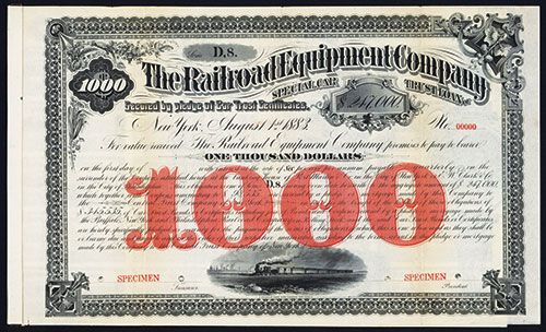 New York, 1883, $1,000 Car Trust Certificate, Series D8. Black border with large red “1000 “ in middle, w/ train across countryside. ABNCo. Specimen w/coupons, XF.
