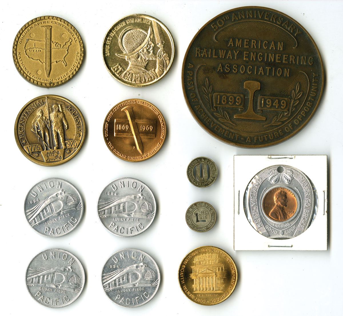 Various States..... Lot of 12 Commemorative Railroad Coins and Medals, Including: Bicentennial Journey American Freedom Train, Union Pacific 'Lucky' coins (2), United RY & Electric Co. fare coin; American Railway Engineering Association 50th Anniversary medallion and more. Coins range from VF to CU condition. (10).