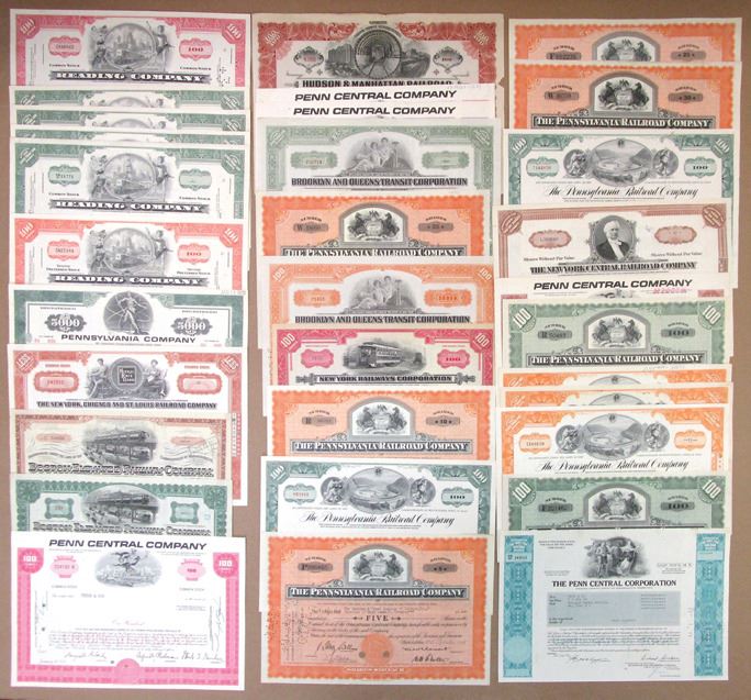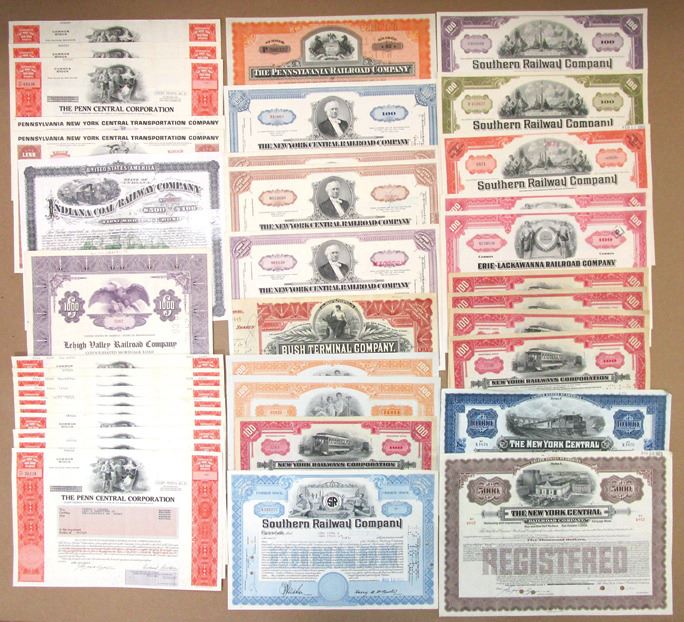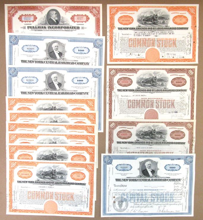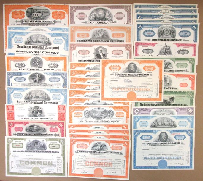 Lot of 115+ I/C and I/U Railroad Certificates, Includes: Hudson & Manhattan Railroad Co.; New York Central Railroad Co.; New York, Chicago and St. Louis Railroad Co.; Pullman Inc.; Penn Central Corp., Pennsylvania Co.; New York Central Railroad Co.; Erie Railroad Co. and many more. Certificates range from Fine to Unc. condition. (120). Sold "AS IS" no returns accepted.
